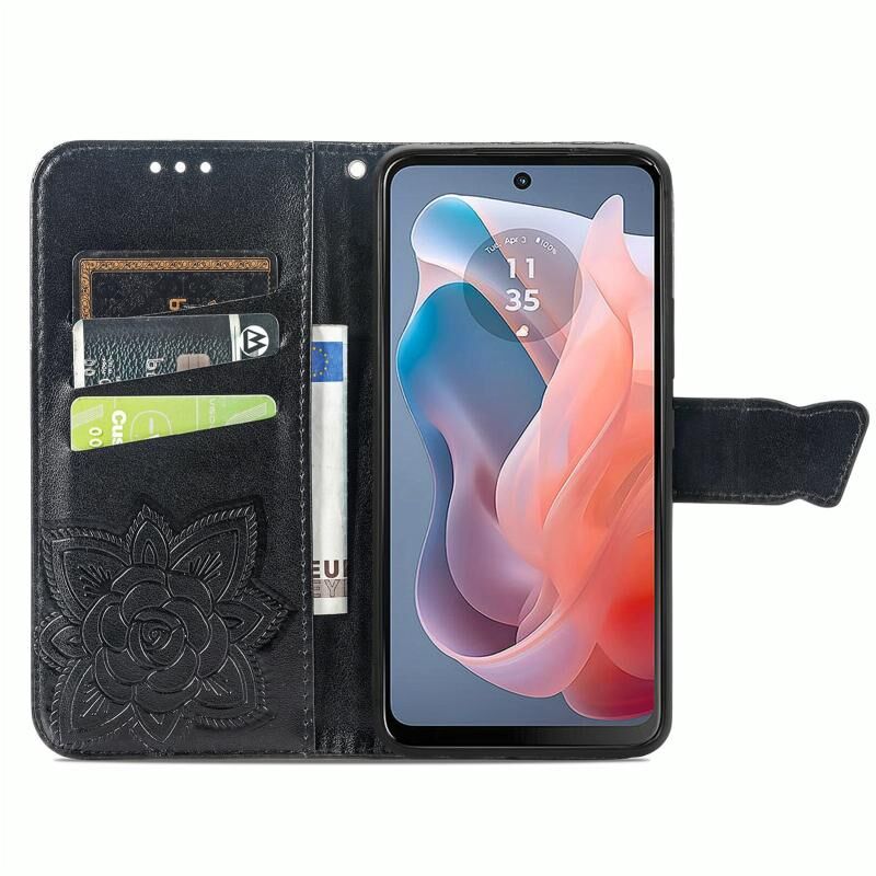 Θήκη κινητού τηλεφώνου δερμάτινη ανάγλυφη με σχέδιο πεταλούδας και λουλουδιών για Motorola Moto G Play 2024 (Μαύρο)
