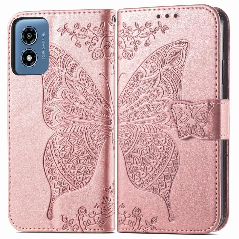 For Motorola Moto G Play 2024 Butterfly Love Flower Embossed Leather Phone Case(Rose Pink)