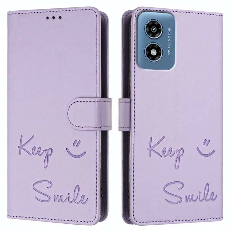 Θήκη τηλεφώνου δερμάτινη με ανάγλυφο χαμόγελο και RFID για Motorola Moto G Play 4G 2024 (Ανοιχτό Μωβ)