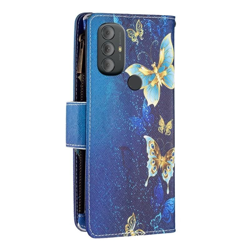 Θήκη τηλεφώνου Motorola Moto G Power 2022 με έγχρωμο σχέδιο, οριζόντια, δερμάτινη με φερμουάρ (Χρυσή Πεταλούδα)