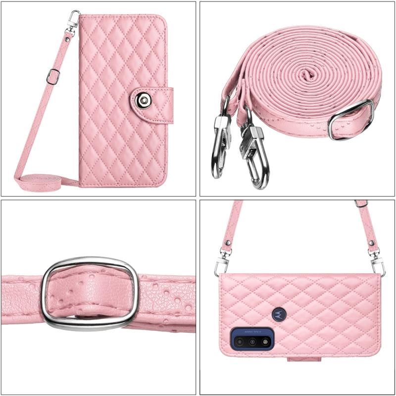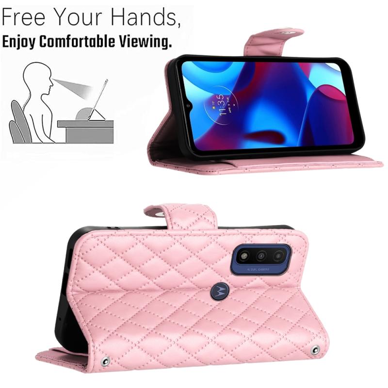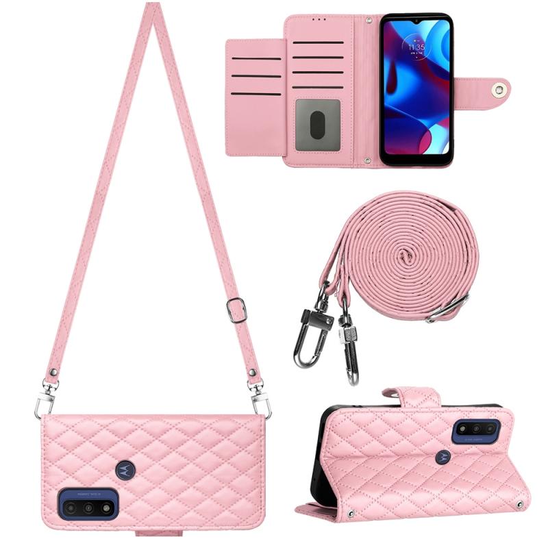 For Motorola Moto G Power 2022 Rhombic Texture Flip Leather Phone Case with Long Lanyard(Pink)
