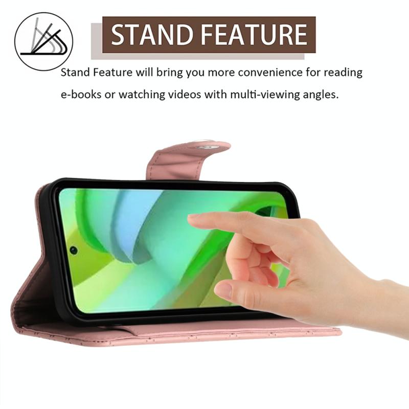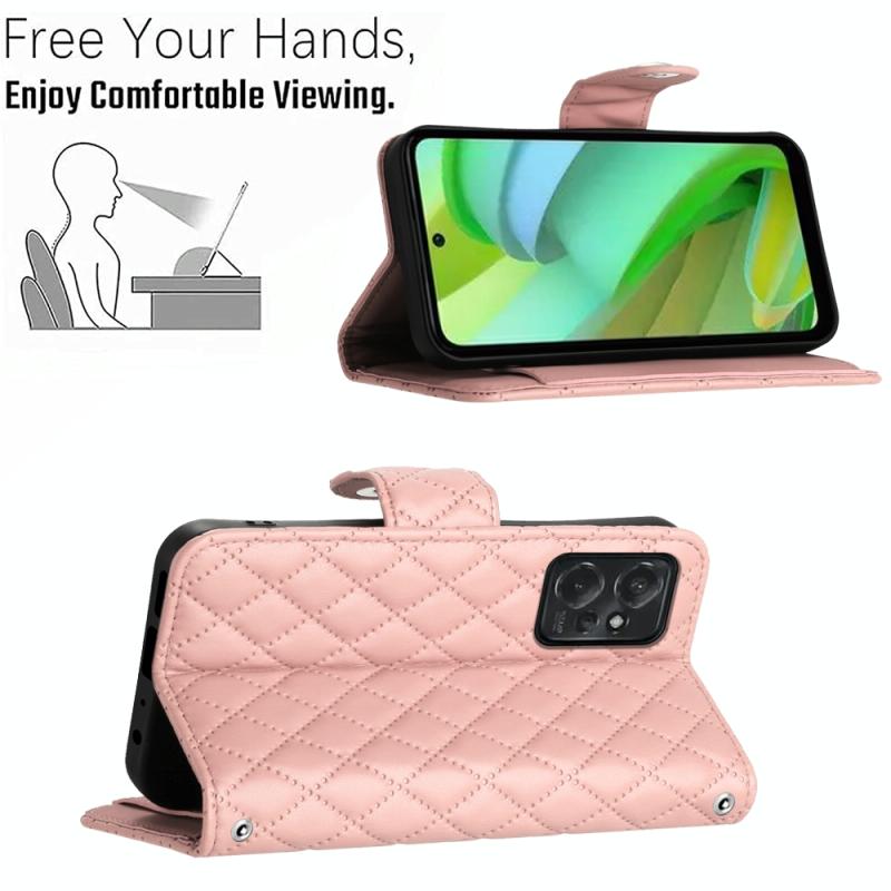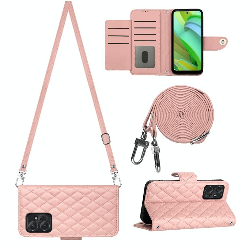 For Motorola Moto G Power 2023 Rhombic Texture Flip Leather Phone Case with Long Lanyard(Coral Pink)