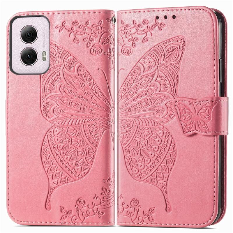 Θήκη κινητού τηλεφώνου από δέρμα με ανάγλυφο σχέδιο πεταλούδας και λουλουδιών για Motorola Moto G Power 2024 (ρόζ)