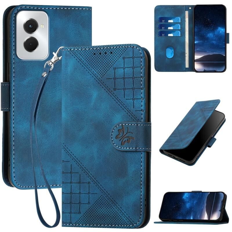 Θήκη κινητού τηλεφώνου δερμάτινη με ανάγλυφο σχέδιο πλέγματος και πεταλούδας για Motorola Moto G Power 5G 2024 με κορδόνι (Σκούρο Μπλε)
