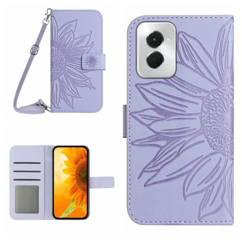 Για Motorola Moto G Power 5G 2024 HT04 Skin Feel Sun Flower ανάγλυφο Flip δερμάτινη θήκη τηλεφώνου με κορδόνι (μωβ)
