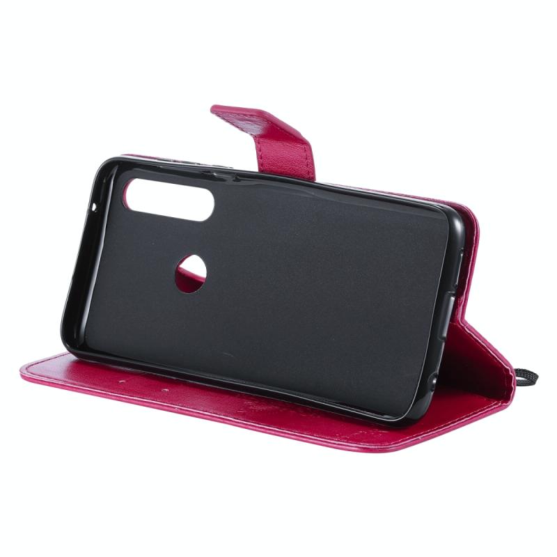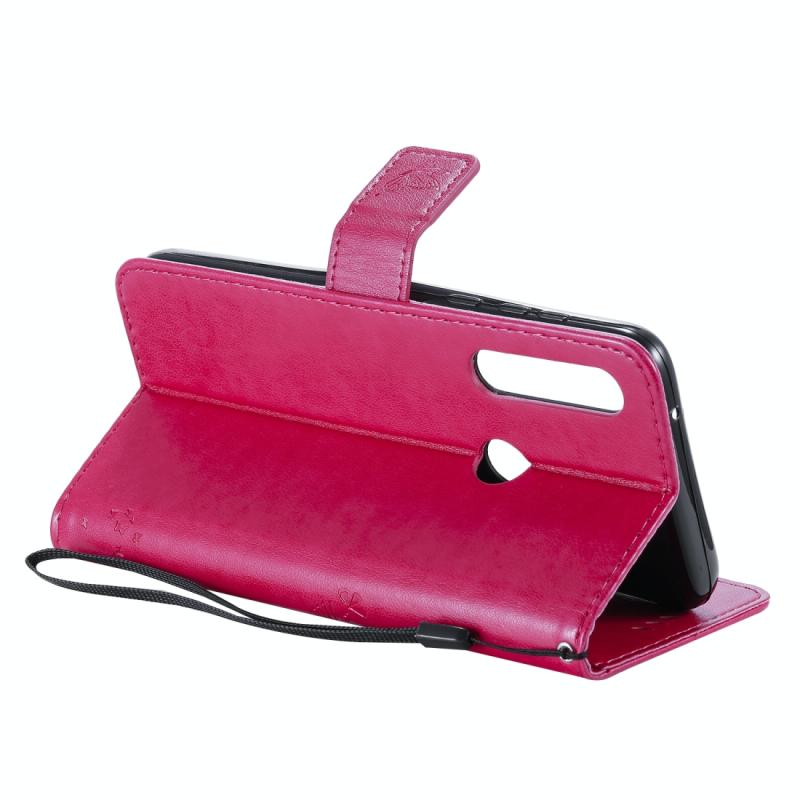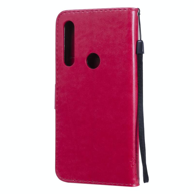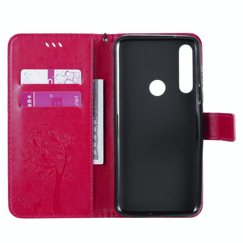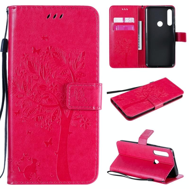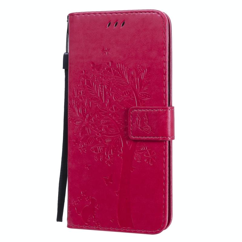 Θήκη δέρματος οριζόντιας αναδίπλωσης για Motorola Moto G Power με ανάγλυφο σχέδιο δέντρου & γάτας, με βάση στήριξης & θήκες καρτών & πορτοφόλι & κορδόνι (Ροζέ κόκκινο)