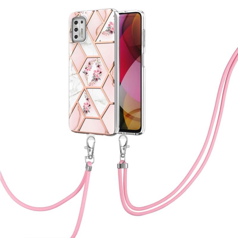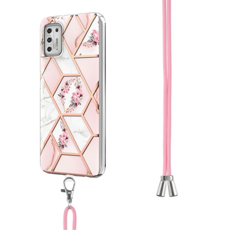 Θήκη προστασίας TPU με ενσωματωμένο κορδόνι για Motorola Moto G Stylus 2021, με ηλεκτρολυτική επιμετάλλωση, συνδυασμό μαρμάρου και λουλουδιών (Ροζ Λουλούδι).