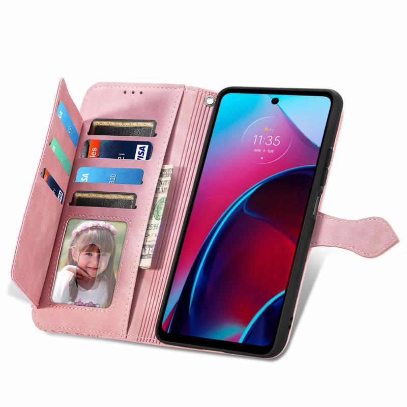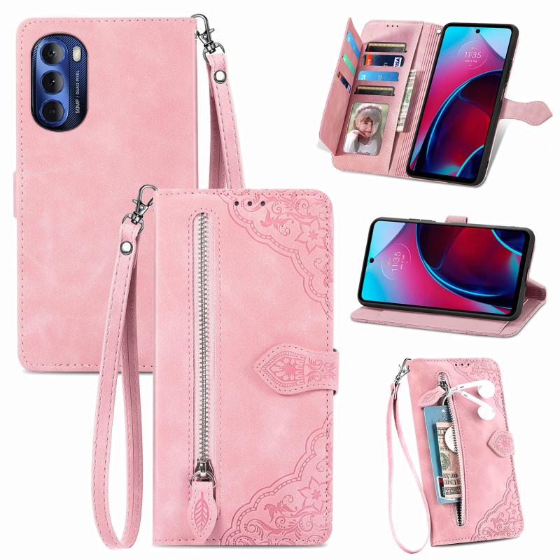 Θήκη κινητού τηλεφώνου από δέρμα με φερμουάρ και ανάγλυφο λουλούδι για Motorola Moto G Stylus 2022 (ρόζ)
