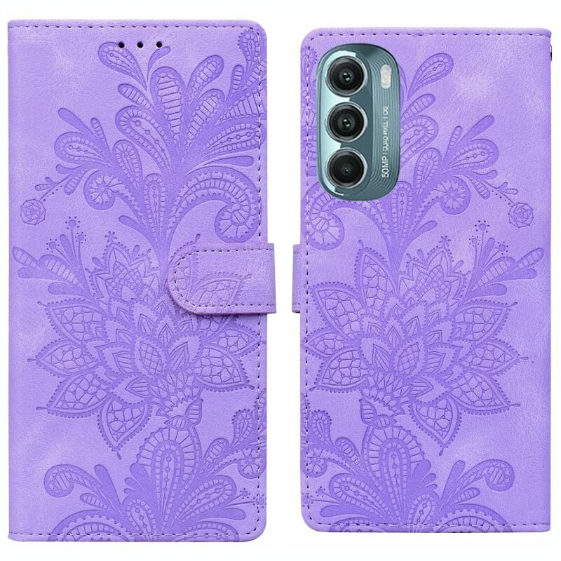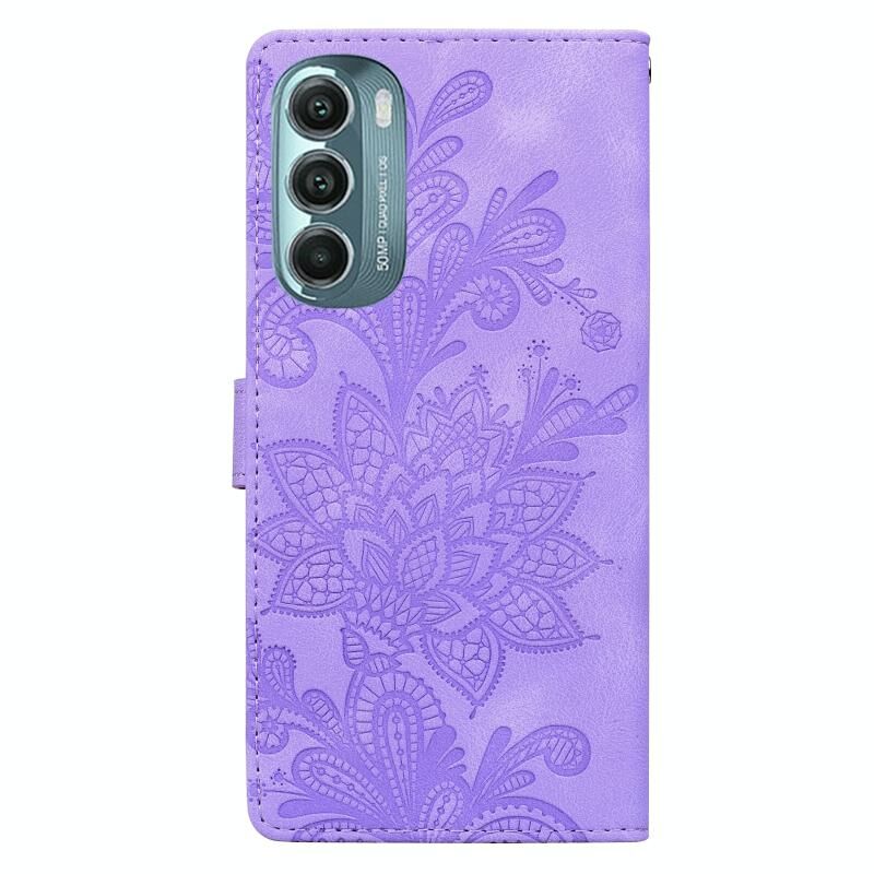 Θήκη τηλεφώνου από δερματίνη PU με μαγνητικό κούμπωμα και λουρί καρπού για Motorola Moto G Stylus 5G 2022, με δαντελένιο floral ανάγλυφο σχέδιο (Πράσινο)