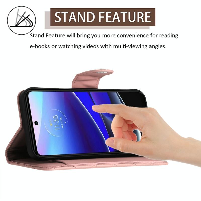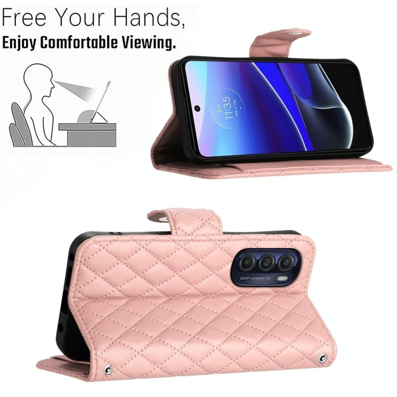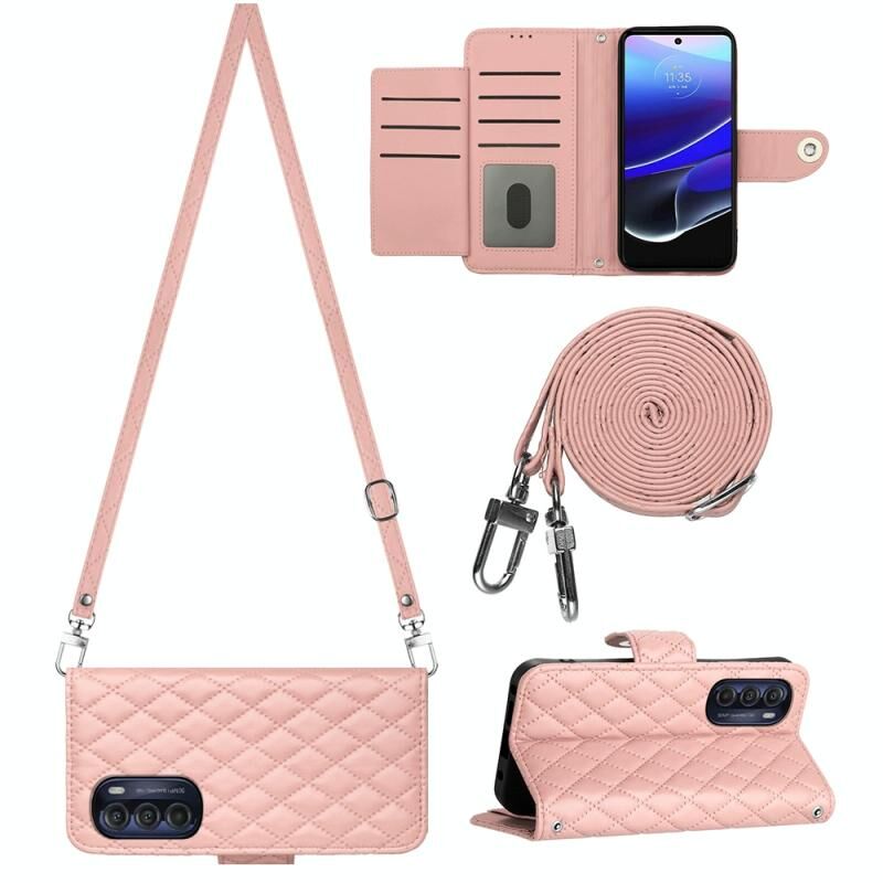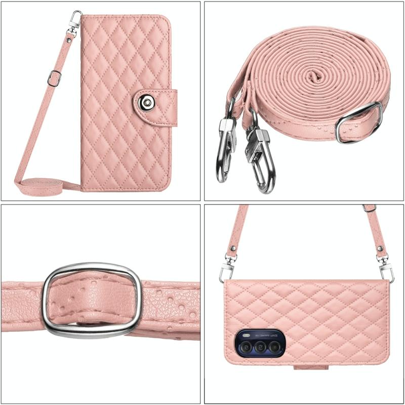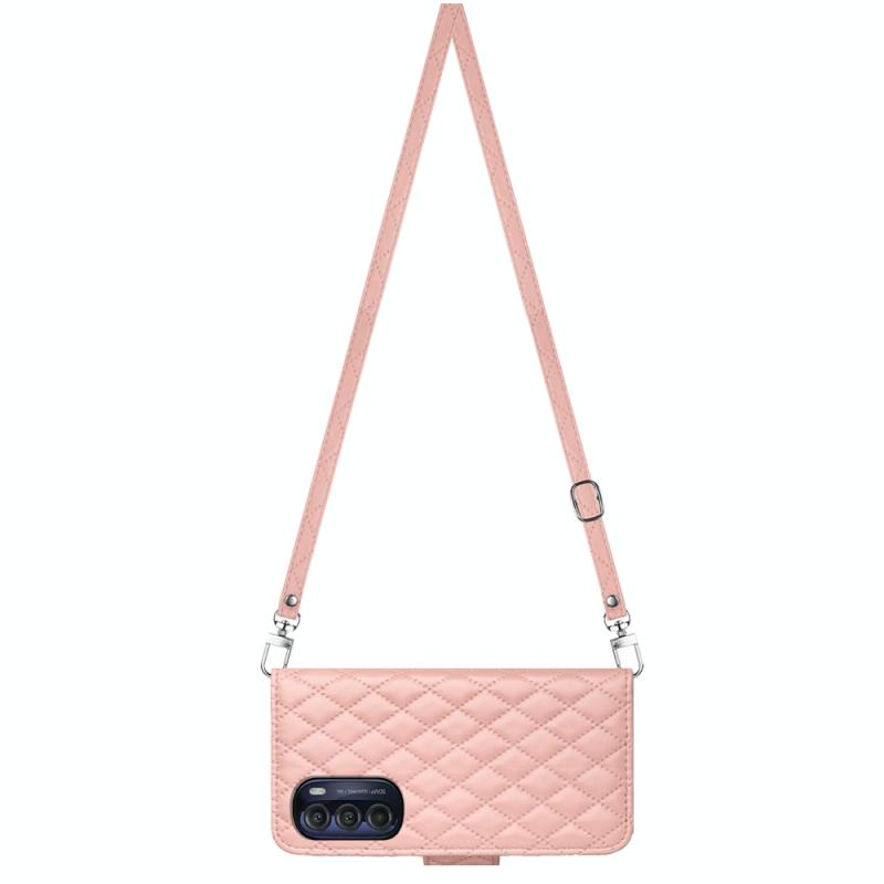 For Motorola Moto G Stylus 5G 2022 Rhombic Texture Flip Leather Phone Case with Long Lanyard(Coral Pink)