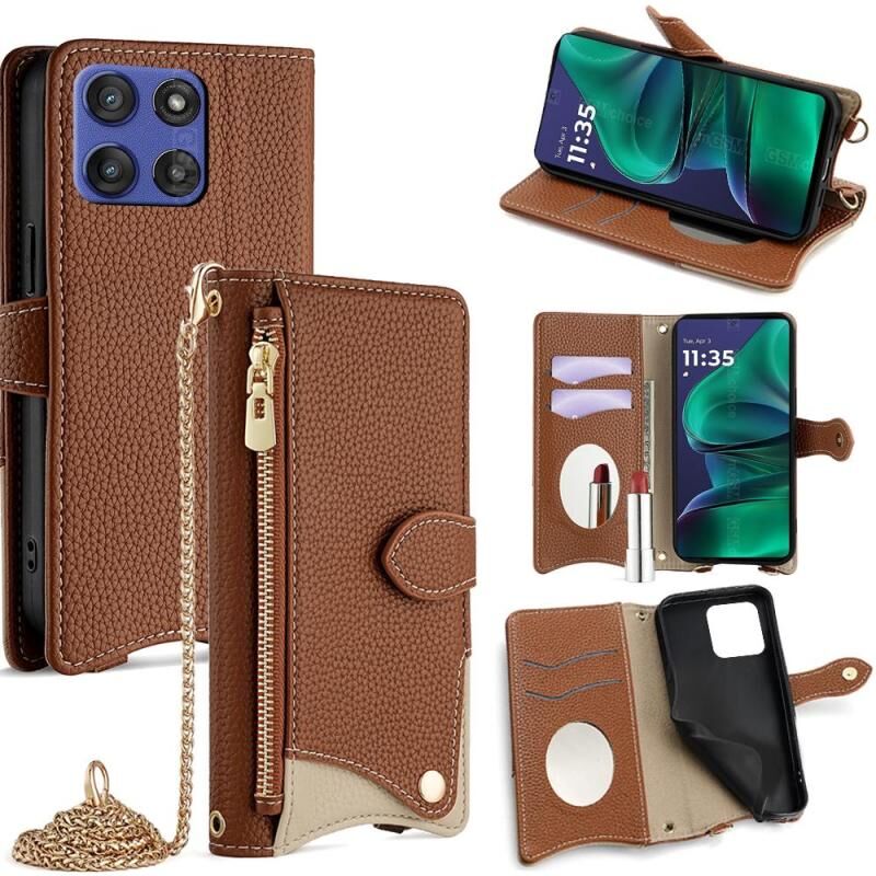 Θήκη κινητού τηλεφώνου Motorola Moto G Stylus 5G 2025, με αλυσίδα και λουρί crossbody, από δέρμα Litchi σε καφέ χρώμα.