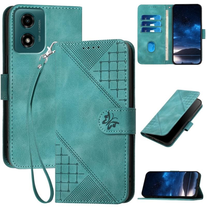 Θήκη τηλεφώνου δερμάτινη με ανάγλυφο σχέδιο πεταλούδας και κορδόνι για Motorola Moto G04 4G Global Grid (Ανοιχτό Μπλε)