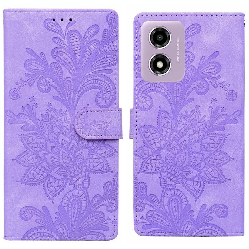 Θήκη τηλεφώνου από PU με μαγνητικό κούμπωμα και λουρί καρπού, με δαντελένιο λουλουδάτο ανάγλυφο σχέδιο για Motorola Moto G04 / E14 / G24 (Μωβ)