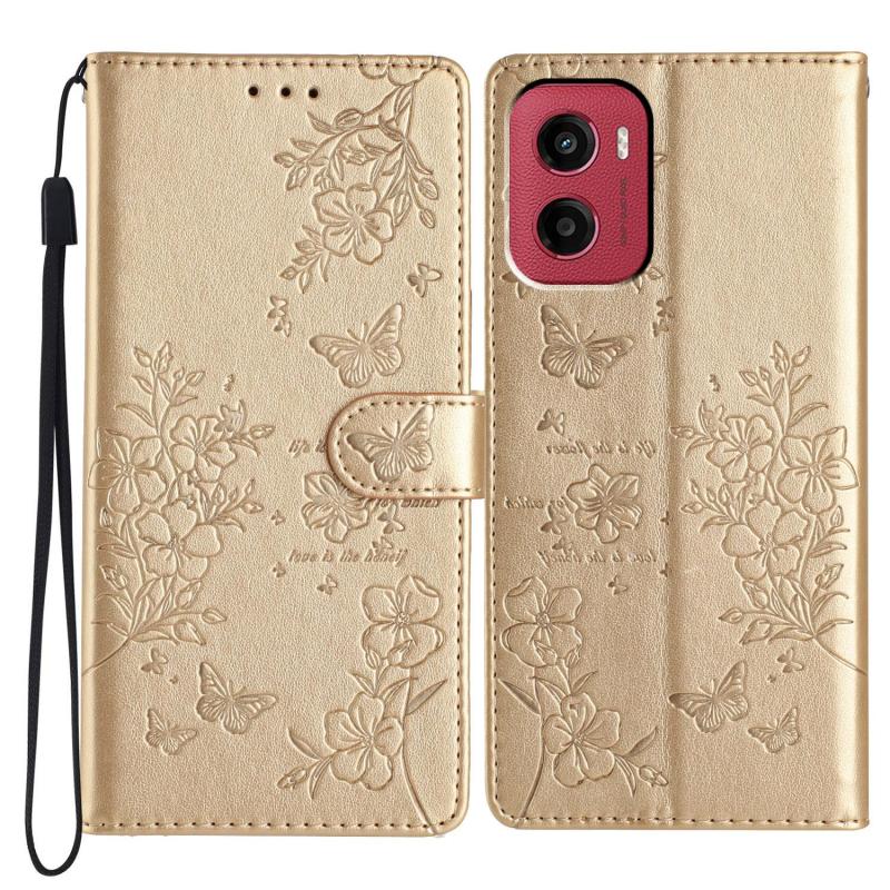 For Motorola Moto G05 Butterflies and Flowers Leather Phone Case(Gold)
