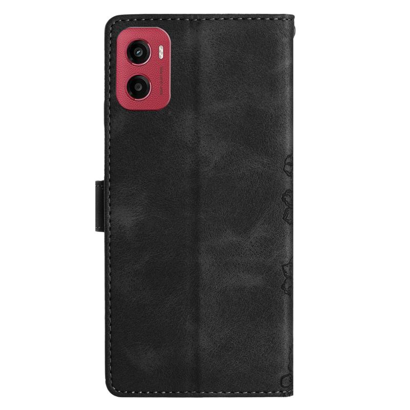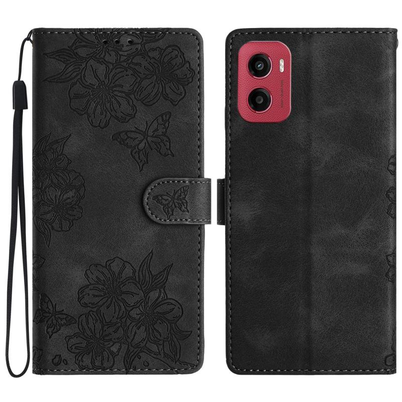 For Motorola Moto G05 Cherry Blossom Butterfly Skin Feel Embossed PU Phone Case(Black)