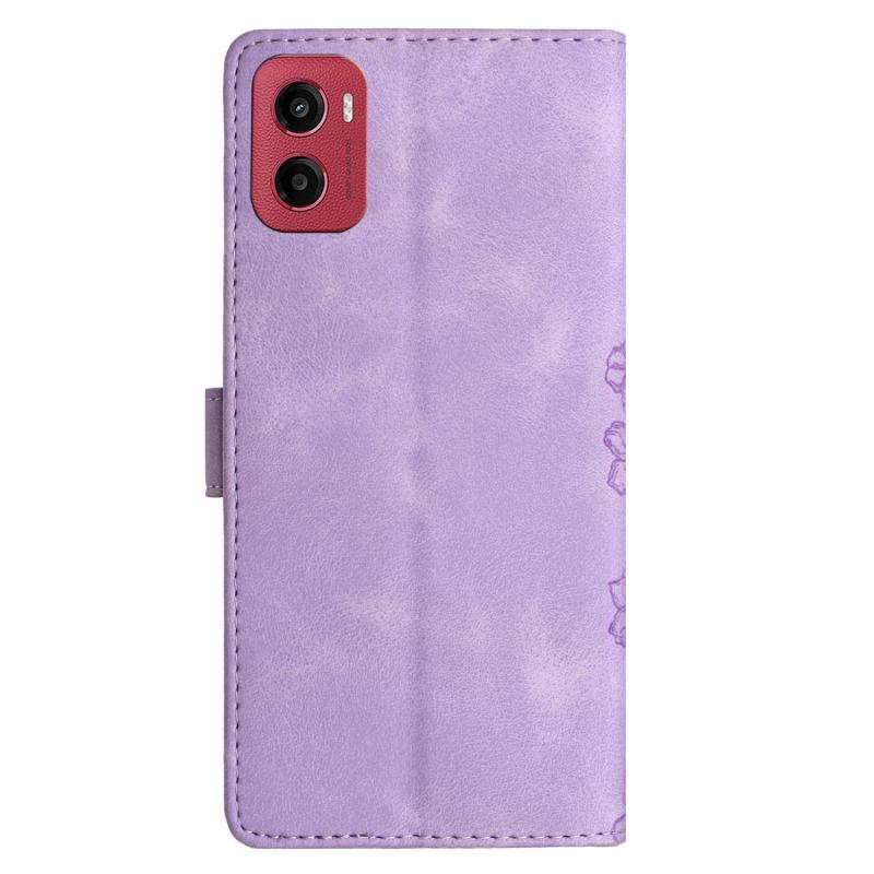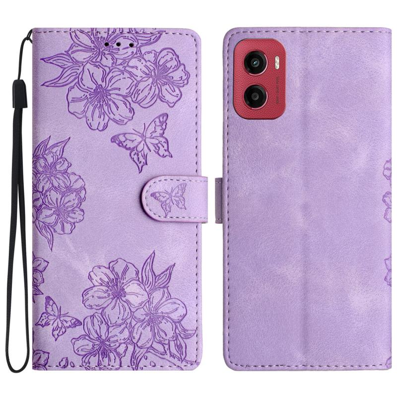 For Motorola Moto G05 Cherry Blossom Butterfly Skin Feel Embossed PU Phone Case(Purple)
