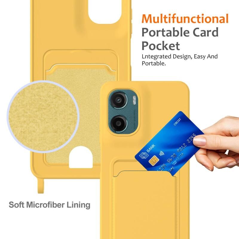For Motorola Moto G05 / E15 4G Integrated Card Bag Solid Color Liquid Silicone Phone Case with Lanyard(Yellow)