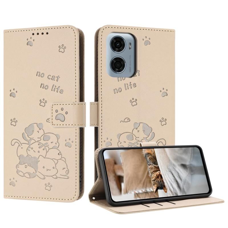 Θήκη δερμάτινη για Motorola Moto G05 με ανάγλυφο σχέδιο γατάκι και λουρί (Μπεζ)