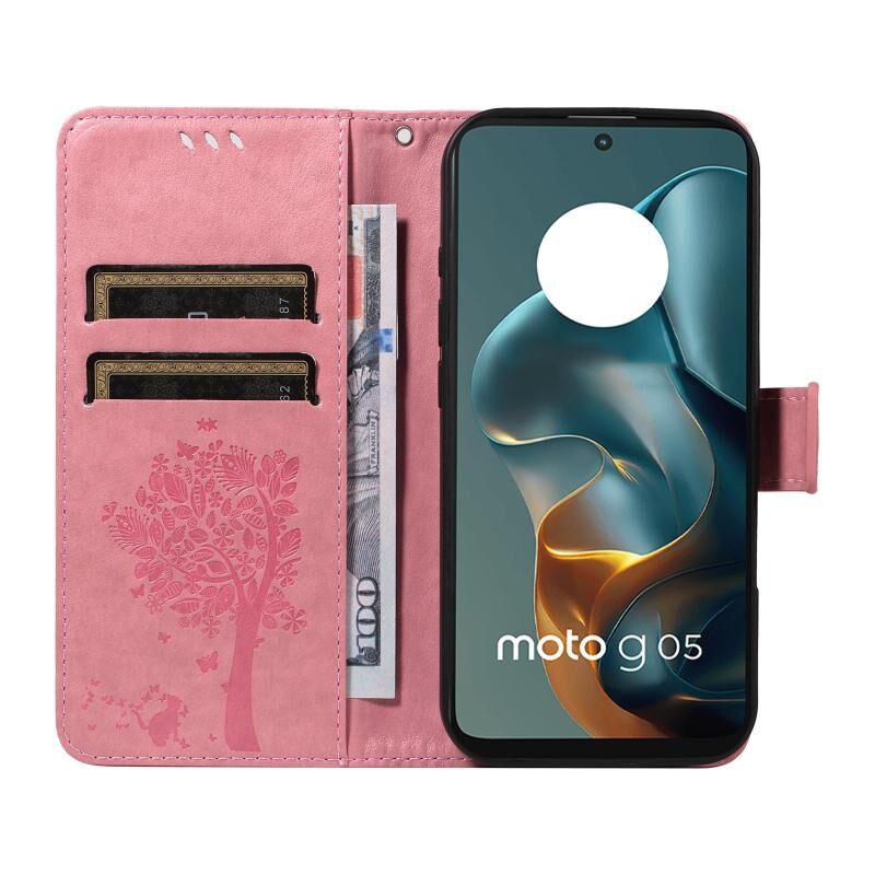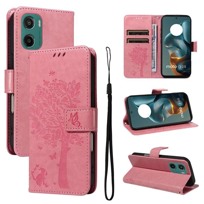 Θήκη τηλεφώνου από δέρμα με σχέδιο αναγλύφου δέντρου & γάτας για Motorola Moto G05 (Ροζ)