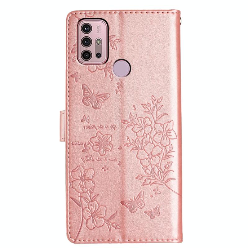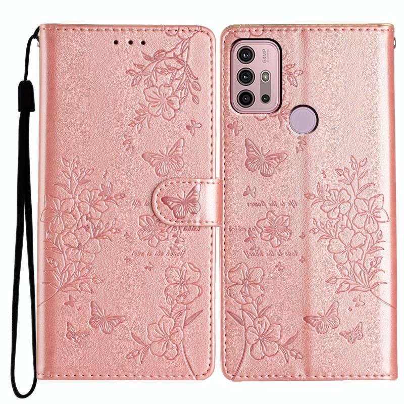 For Motorola Moto G10 / G20 Butterflies and Flowers Leather Phone Case(Rose Gold)