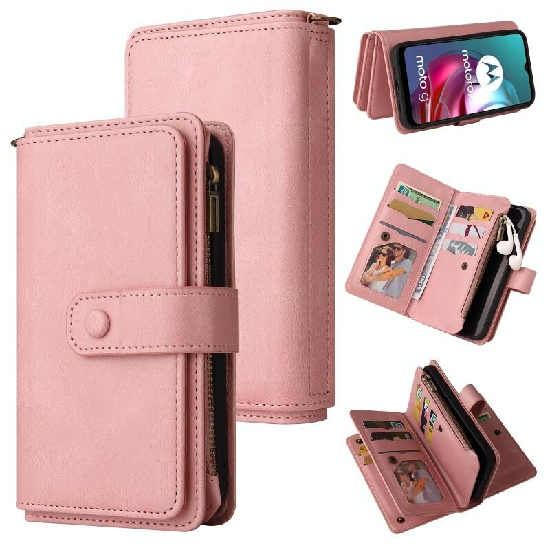 Για το Motorola Moto G10 Skin Feel PU + TPU Οριζόντια Flip δερμάτινη θήκη με θήκη & 15 κάρτες υποδοχή & πορτοφόλι & φερμουάρ τσέπη & κορδόνι (ροζ)