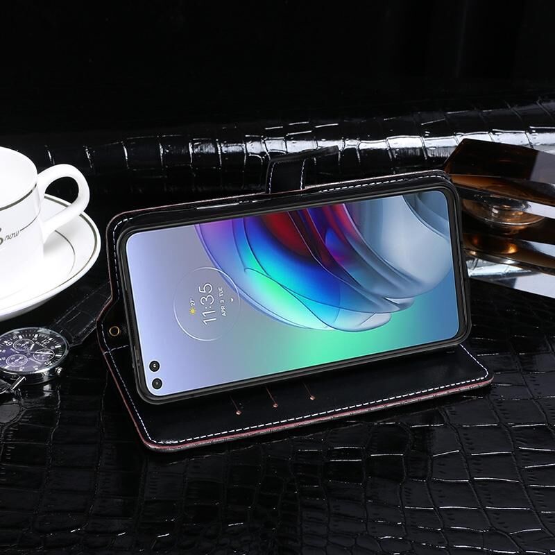 Θήκη δέρματος οριζόντιας αναδίπλωσης με υφή κροκόδειλου idewei για Motorola Moto G100 με βάση & υποδοχές καρτών & πορτοφόλι (Μαύρο) (idewei)