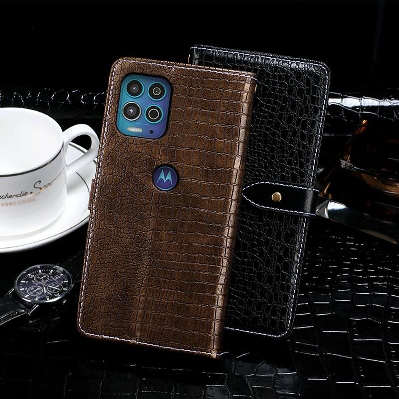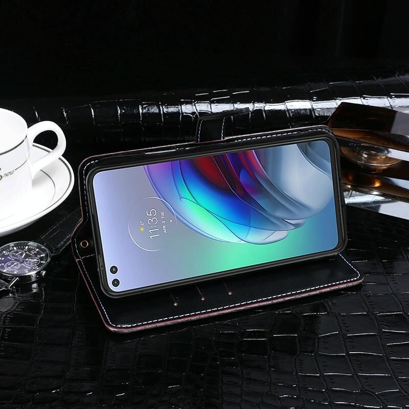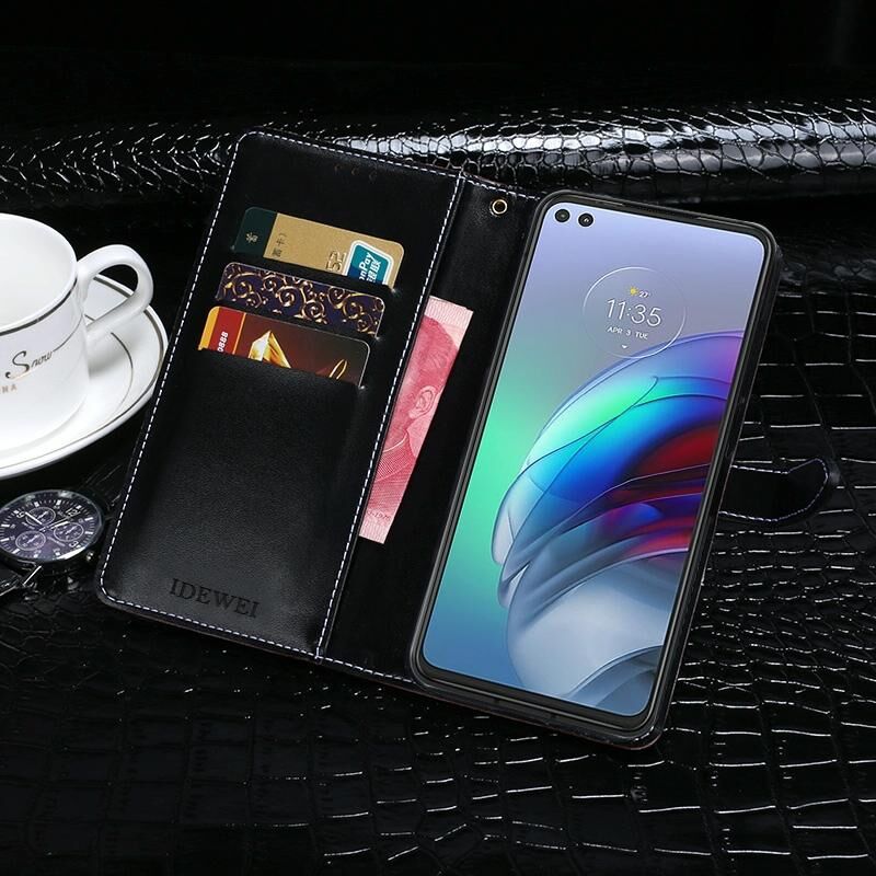 Θήκη δέρματος οριζόντιας αναδίπλωσης με υφή κροκόδειλου idewei για Motorola Moto G100 με βάση & υποδοχές καρτών & πορτοφόλι (Μαύρο) (idewei)