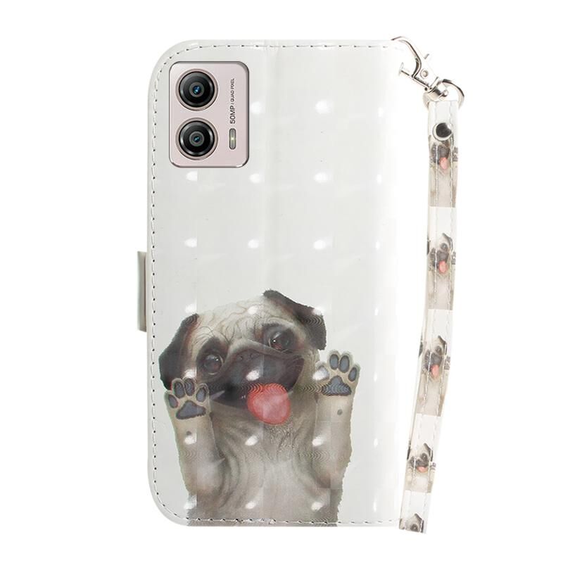 Θήκη τηλεφώνου δερμάτινη, οριζόντια, αναδιπλούμενη, με έγχρωμο 3D σχέδιο (Pug) για Motorola Moto G13 / G23 / G53.