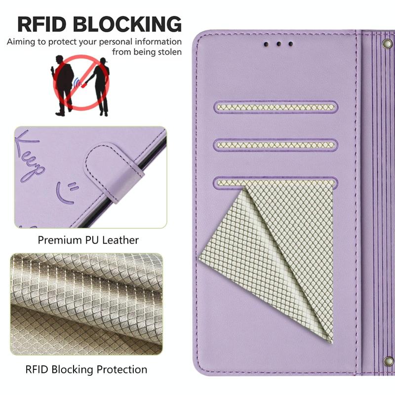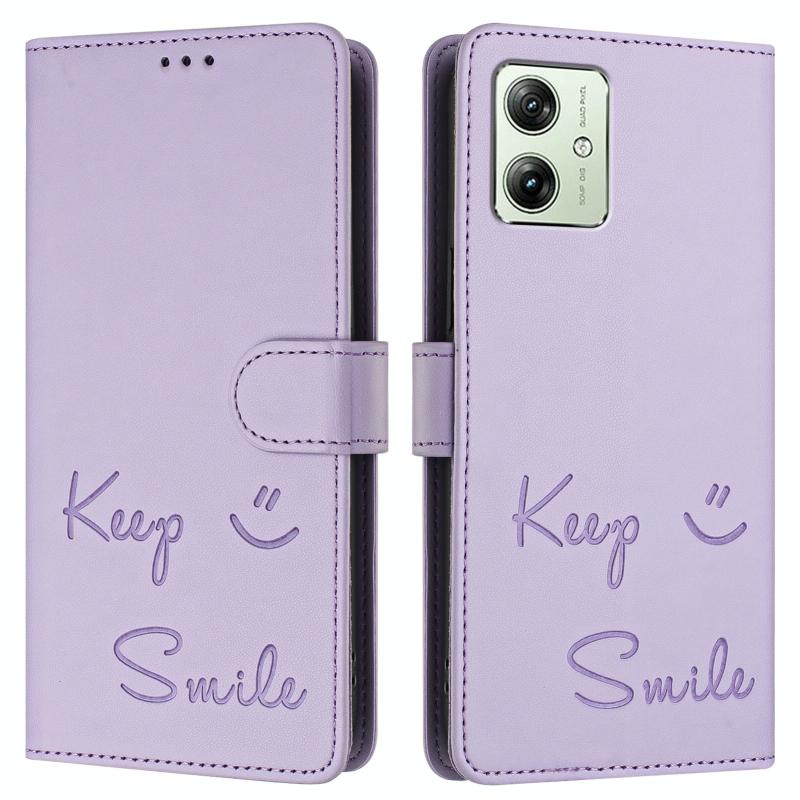 Θήκη τηλεφώνου δερμάτινη με ανάγλυφο χαμόγελο και RFID για Motorola Moto G14 4G (Μέντας Πράσινο)