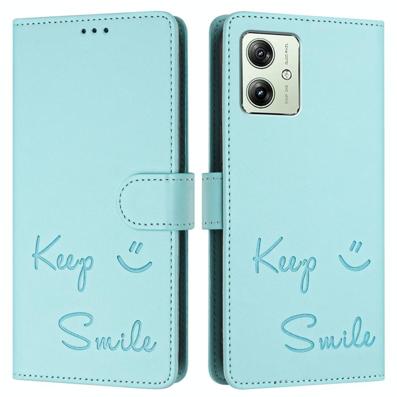 Θήκη τηλεφώνου δερμάτινη με ανάγλυφο χαμόγελο και RFID για Motorola Moto G14 4G (Μέντας Πράσινο)