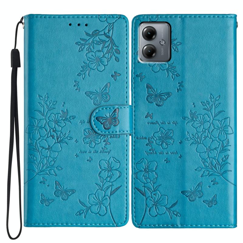 For Motorola Moto G14 Butterflies and Flowers Leather Phone Case(Blue)