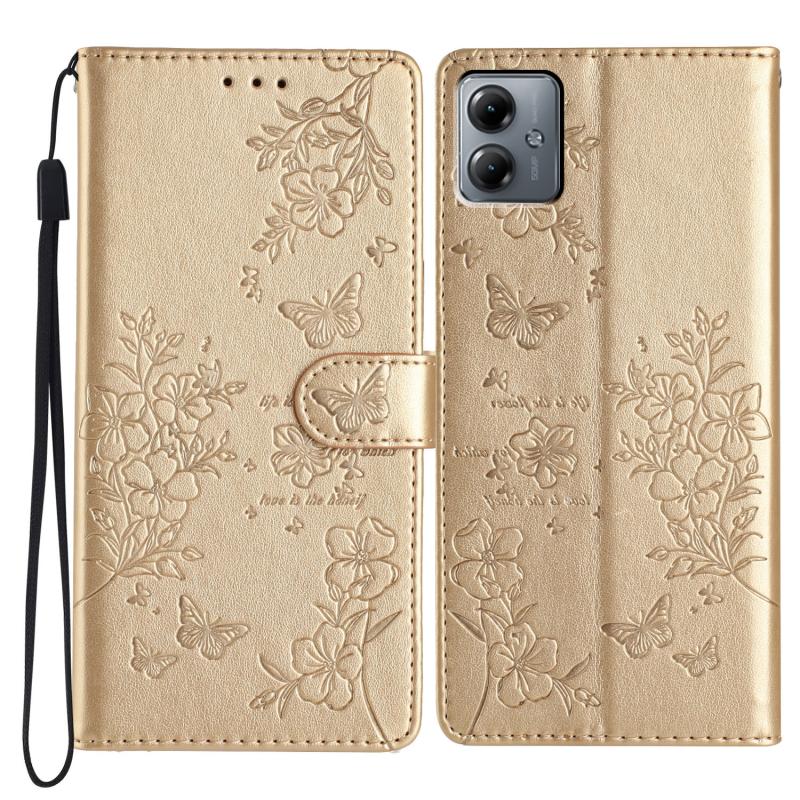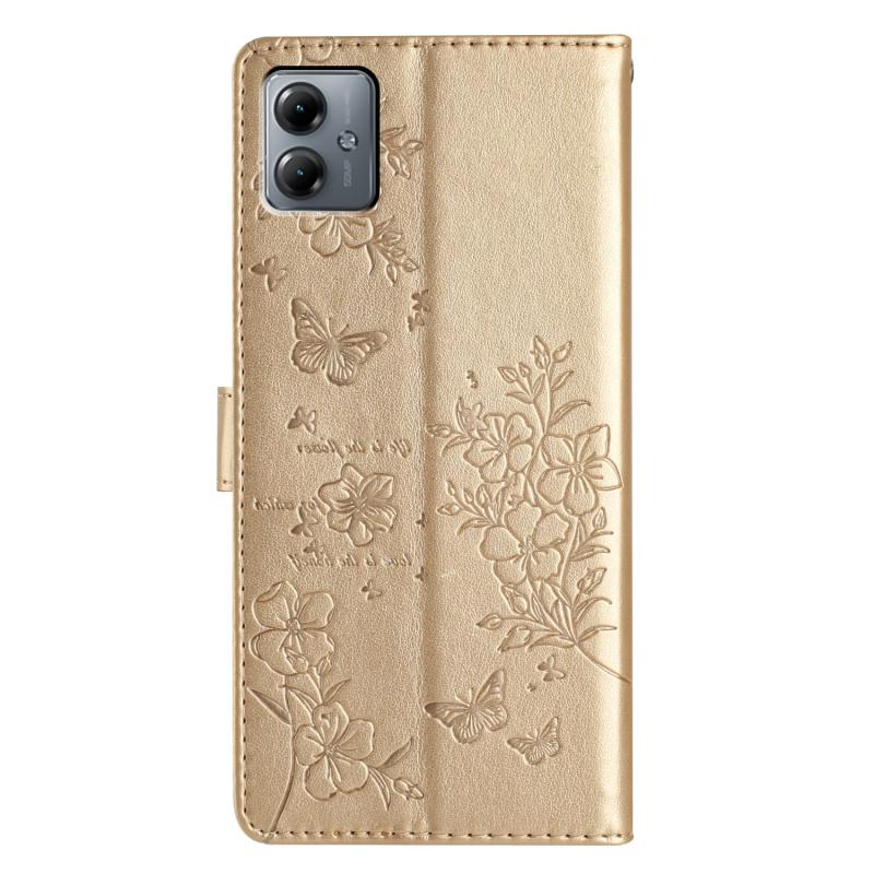 For Motorola Moto G14 Butterflies and Flowers Leather Phone Case(Gold)