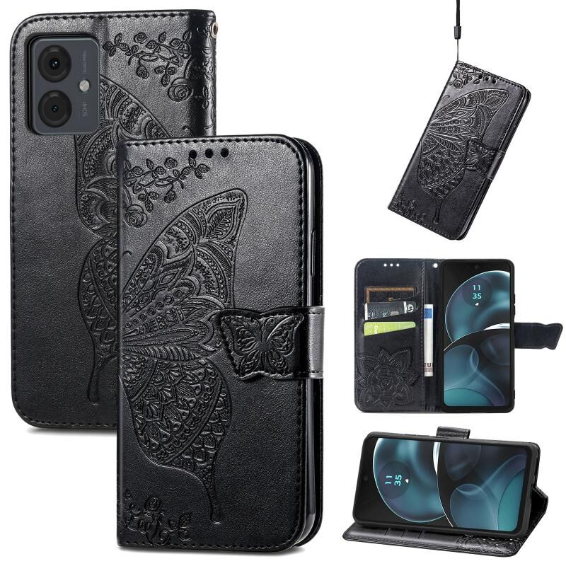 Θήκη κινητού τηλεφώνου από δέρμα με ανάγλυφο σχέδιο πεταλούδας και λουλουδιών για Motorola Moto G14 (Μαύρο)