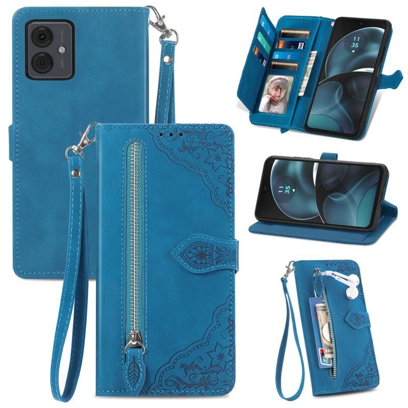Θήκη κινητού τηλεφώνου δερμάτινη με φερμουάρ και ανάγλυφο λουλούδι για Motorola Moto G14 (Ροζ)