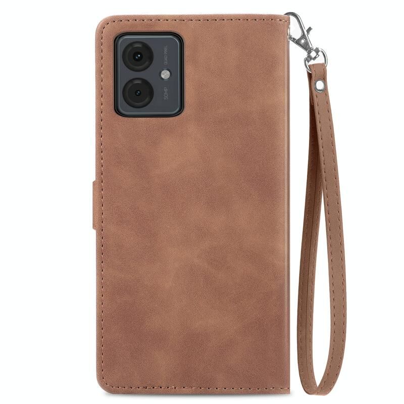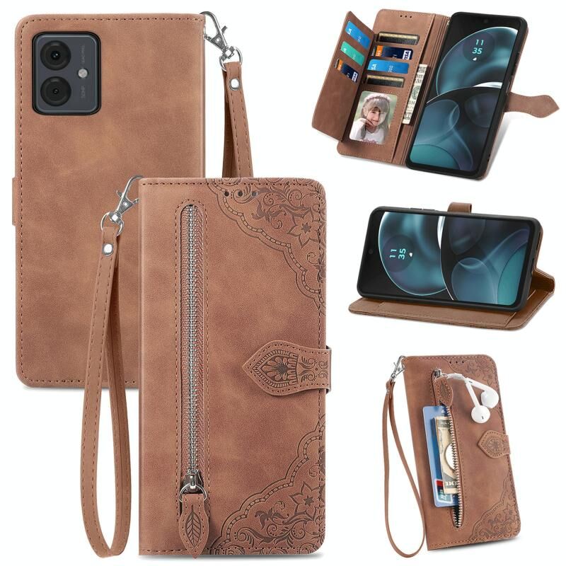 Θήκη κινητού τηλεφώνου δερμάτινη με φερμουάρ και ανάγλυφο λουλούδι για Motorola Moto G14 (Ροζ)