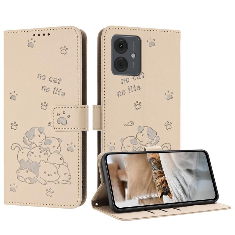 Θήκη δερμάτινη για Motorola Moto G14 με ανάγλυφο σχέδιο γατάκι και κορδόνι (Μπεζ)