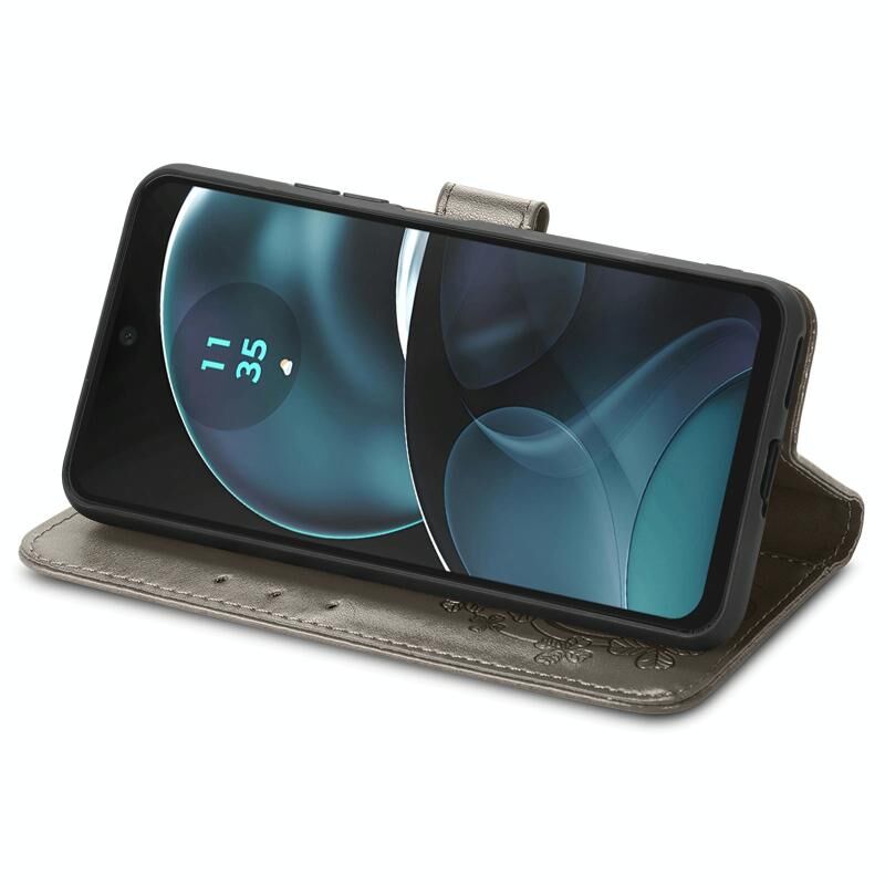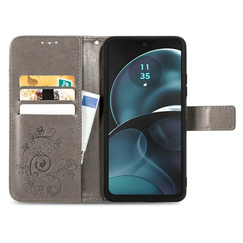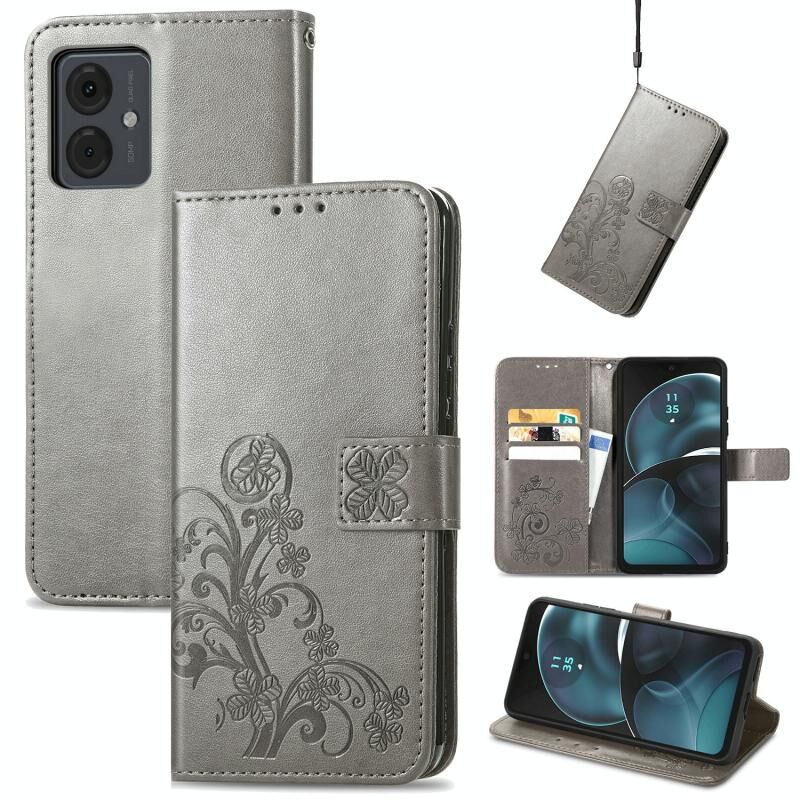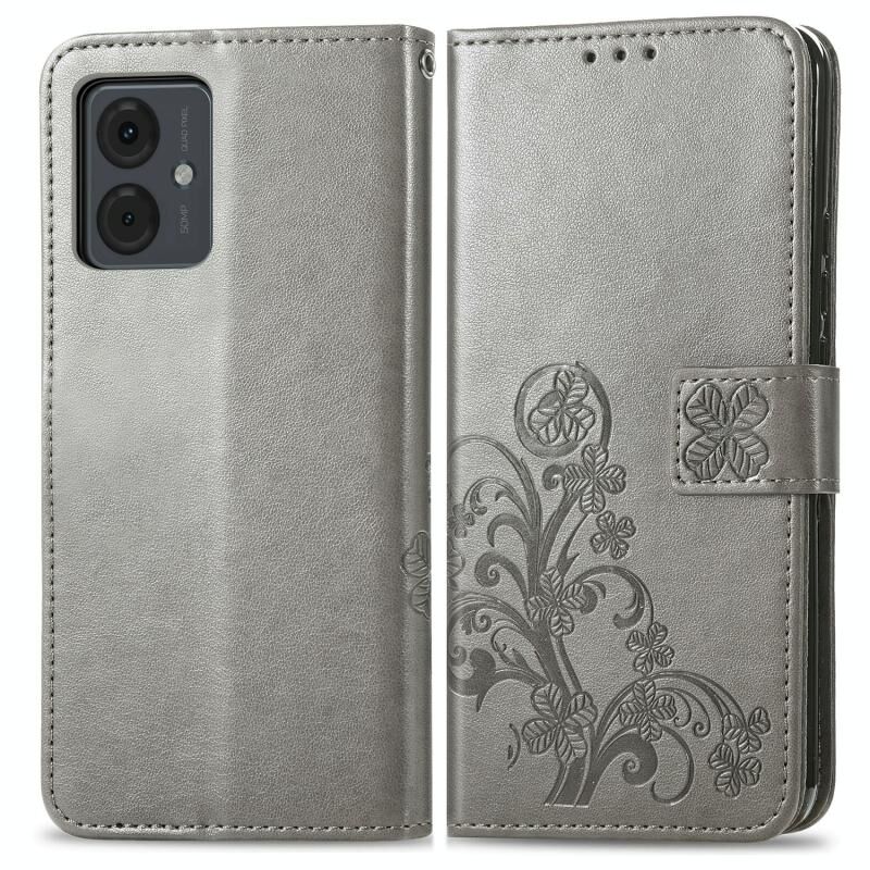 Για Motorola Moto G14 τετράφυλλο κούμπωμα ανάγλυφη δερμάτινη θήκη τηλεφώνου (γκρι)