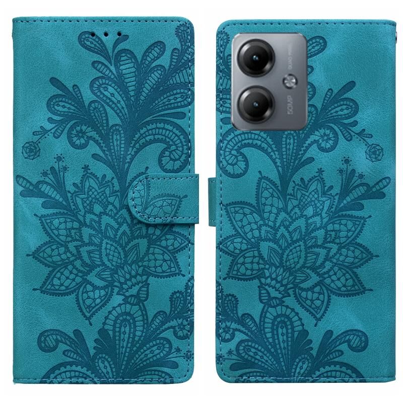 Θήκη κινητού τηλεφώνου Motorola Moto G14 με δαντέλα, λουλουδάτο ανάγλυφο, μαγνητικό κούμπωμα και λουρί καρπού (Πράσινο)