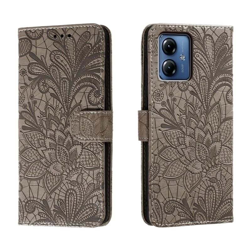 Για Motorola Moto G14 Δαντέλα λουλούδι ανάγλυφο Flip δερμάτινη θήκη τηλεφώνου (γκρι)