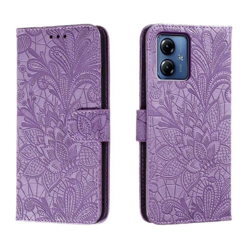 Για Motorola Moto G14 Δαντέλα λουλούδι ανάγλυφο Flip δερμάτινη θήκη τηλεφώνου (μωβ)