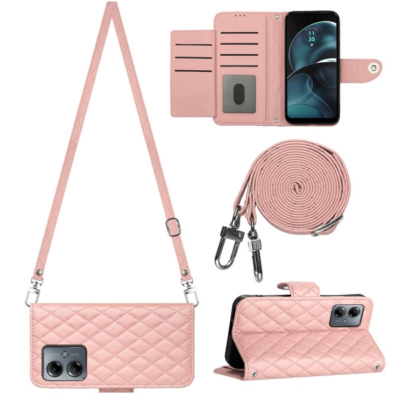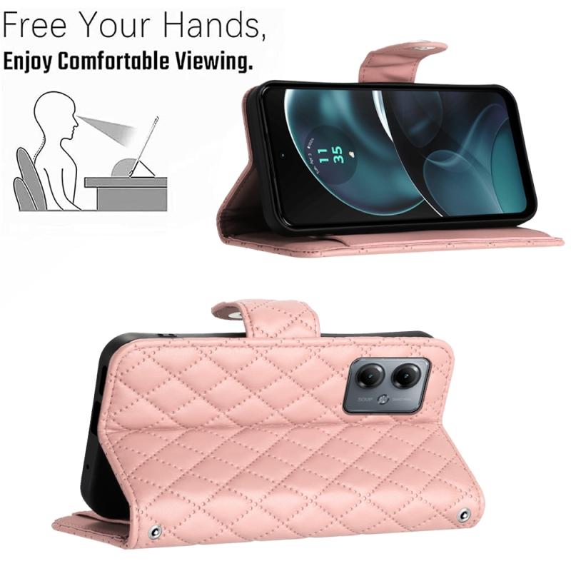 For Motorola Moto G14 Rhombic Texture Flip Leather Phone Case with Long Lanyard(Coral Pink)