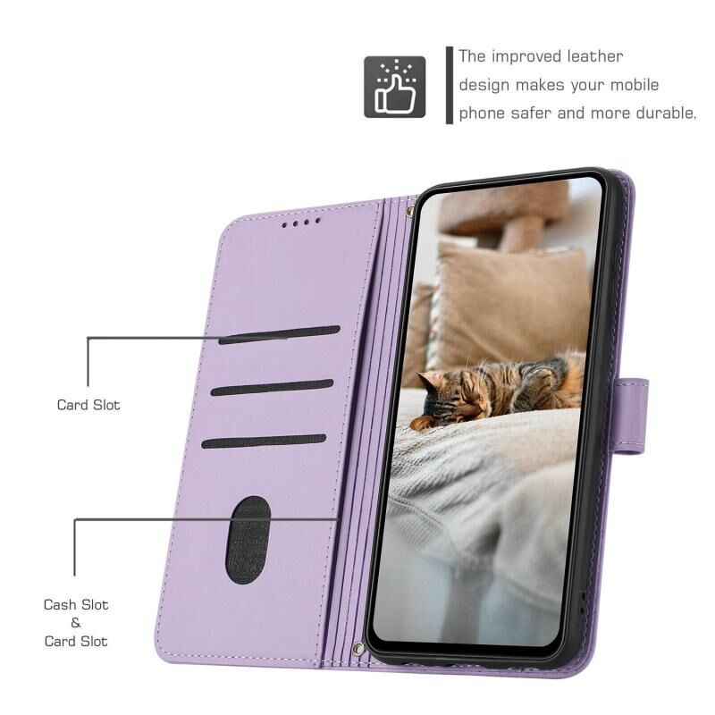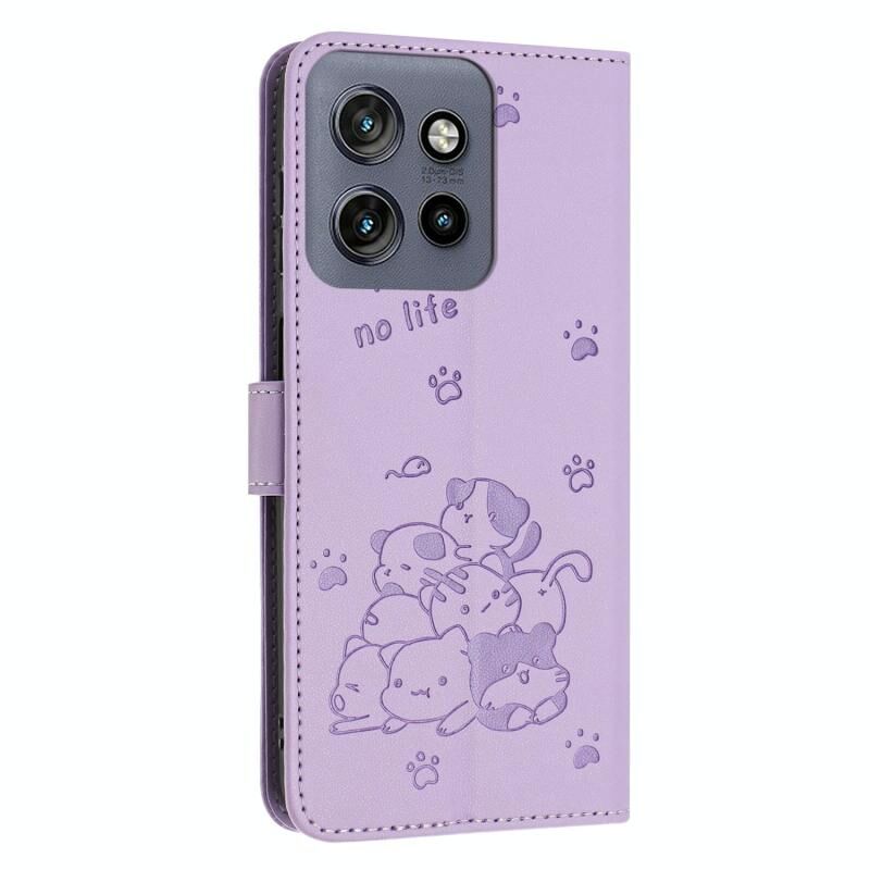 Θήκη δερμάτινη για Motorola Moto G15 με ανάγλυφο γατάκι και κορδόνι (Μωβ)