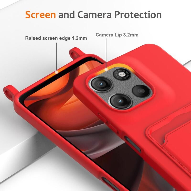 Θήκη κινητού τηλεφώνου με ενσωματωμένη θήκη καρτών για Motorola Moto G15 / G15 Power 4G, από υγρή σιλικόνη σε μονόχρωμο χρώμα, με κορδόνι (Κόκκινο)