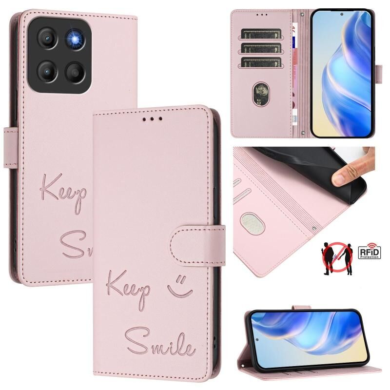 Θήκη τηλεφώνου δερμάτινη με ανάγλυφο χαμόγελο RFID για Motorola Moto G15 (Μέντας Πράσινο)