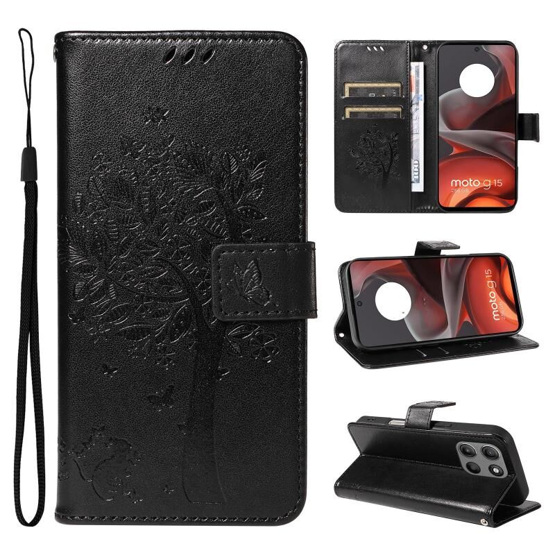 Θήκη τηλεφώνου από δέρμα με σχέδιο αναγλύφου δέντρου & γάτας για Motorola Moto G15 (Μαύρο)