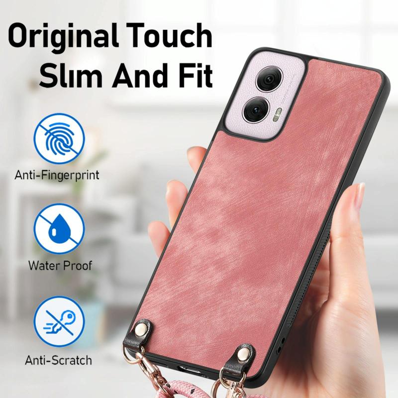 Θήκη κινητού τηλεφώνου Motorola Moto G15 με δερμάτινη πλάτη PC Vintage και λουρί crossbody (ρόζ)