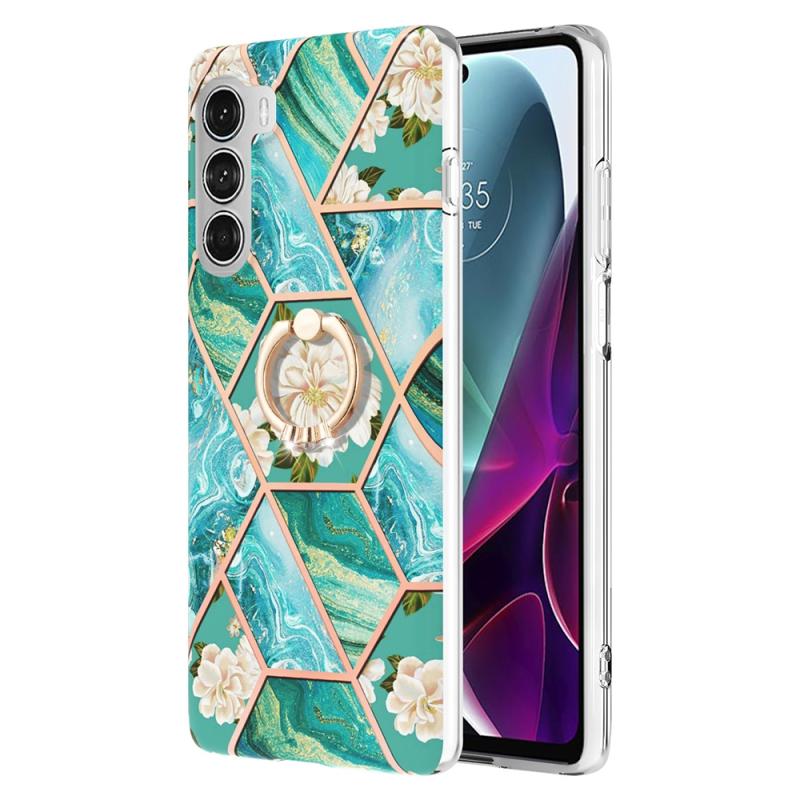 For Motorola Moto G200 5G Splicing Marble Flower Pattern TPU Ring Holder Case(Blue Flower)