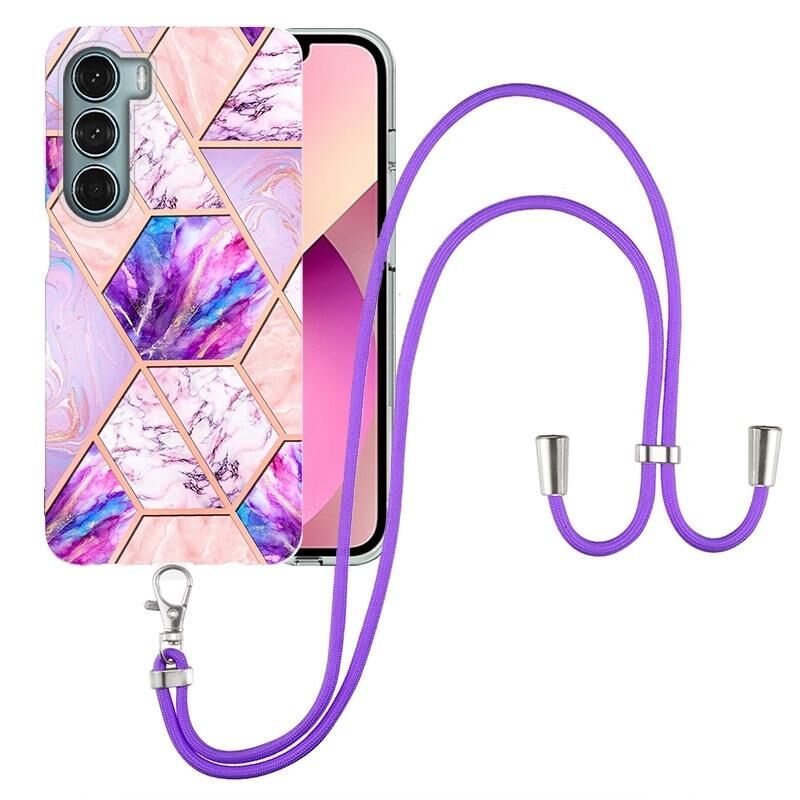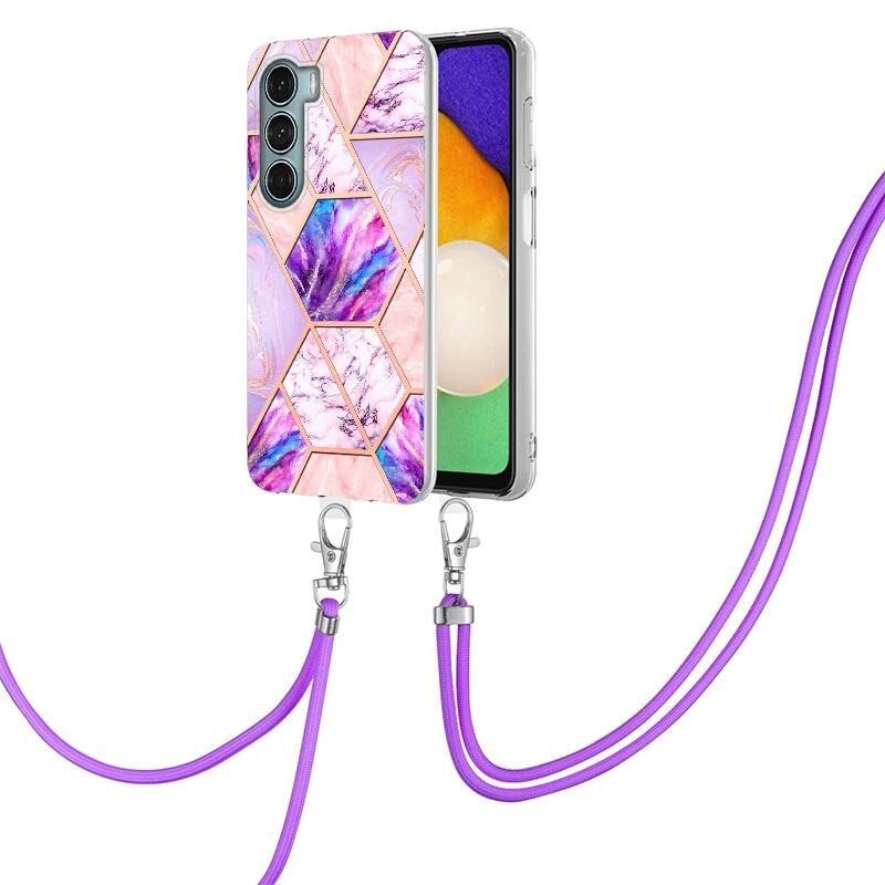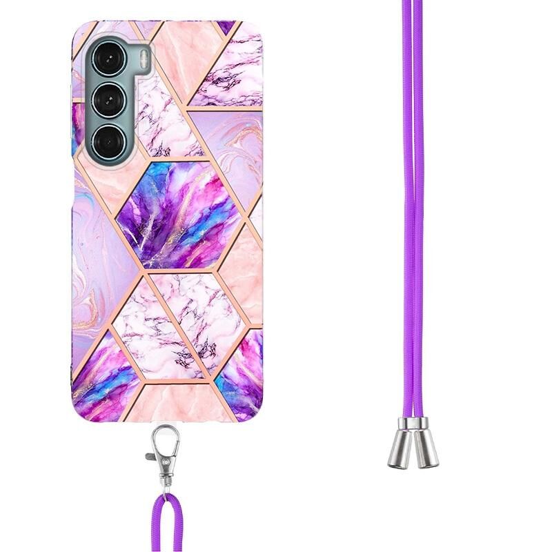 Θήκη τηλεφώνου TPU με γαλβανισμό και μαρμάρινη σύνθεση για Motorola Moto G200 με κορδόνι (ανοιχτό μωβ)