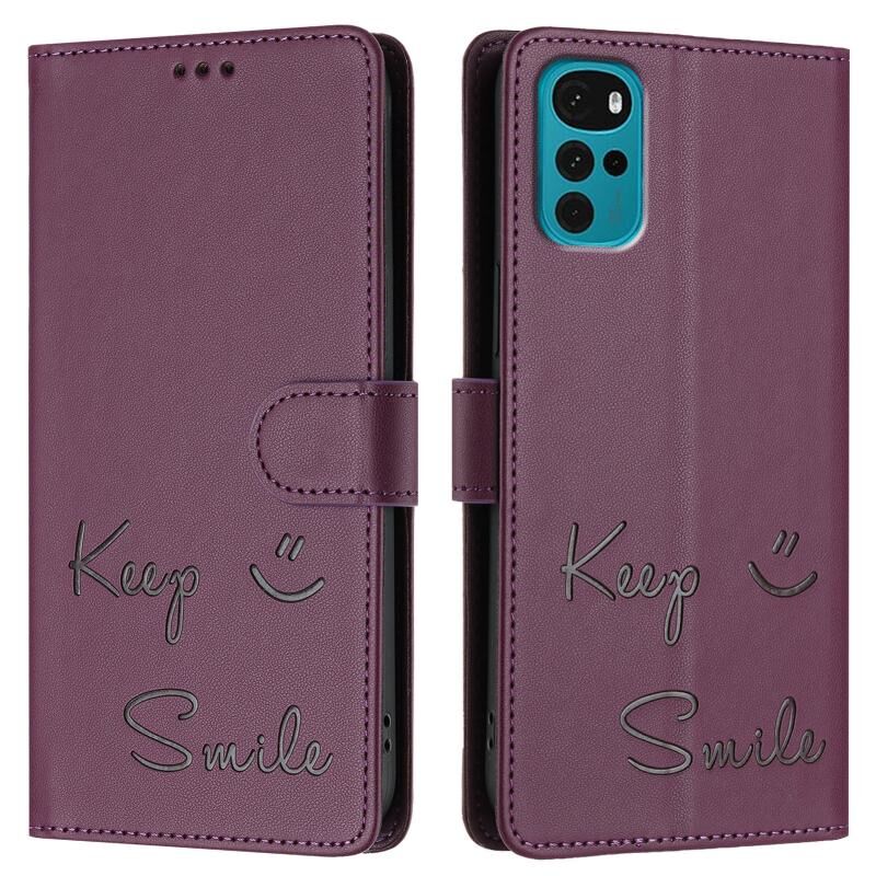 Θήκη τηλεφώνου δερμάτινη με ανάγλυφο χαμόγελο RFID για Motorola Moto G22 4G/E32s (Βιολετί)