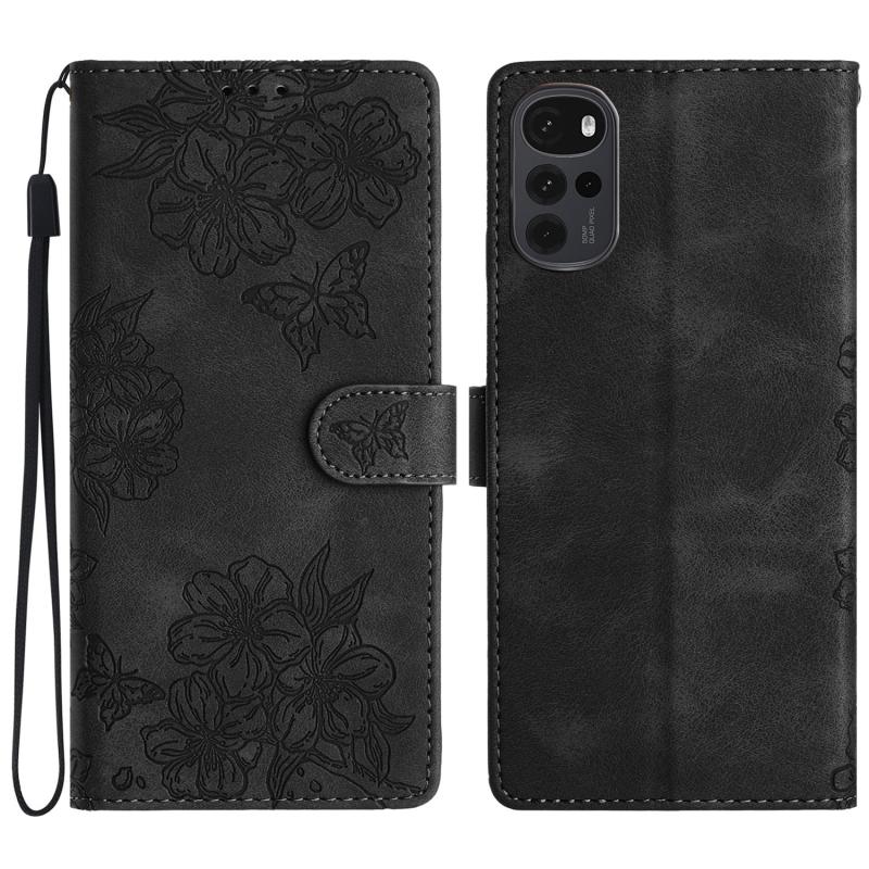 For Motorola Moto G22 Cherry Blossom Butterfly Skin Feel Embossed PU Phone Case(Black)
